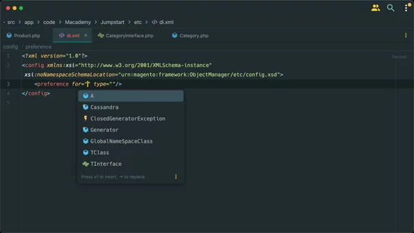 XML plays a crucial role in Magento 2 when it comes to dependencies. We can instruct the Object Manager to use the Category class as the implementation whenever CategoryInterface is invoked. This is referred to as a class preference. We’ll tell Magento which class is preferred, and it’ll use this to determine which class to substitute in for the interface at runtime.