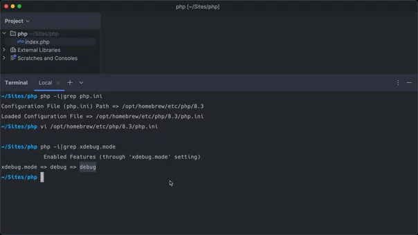 /opt/homebrew/etc/php/8.3/php.iniOpen the file, and look for the xdebug.mode property. This property may not yet exist, in which case you can add it to the file.