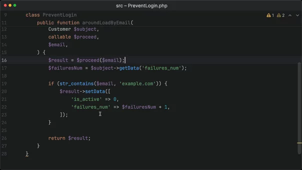 This code first runs the original function using $proceed. Then it checks if the email contains "example.com". If it does, we mark the account as inactive and increment the failure counter. We then either return the original customer data, or the modified version with the account marked as inactive — effectively blocking these users from logging in.