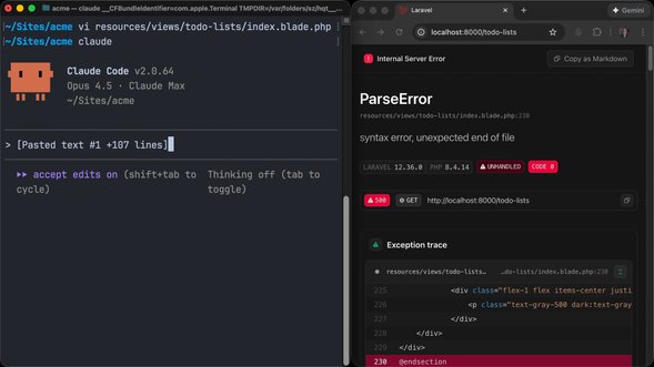 In my Laravel app, I have Vite installed which automatically reloads the site as changes are happening. Claude Code will occasionally write something that contains a bug — like referencing a variable that wasn't created yet, or forgetting to close a bracket on an i...
