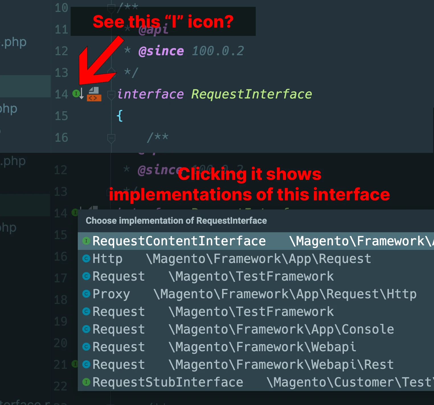 You’ll notice a little “i” icon in PhpStorm. Click it, and you’ll see all classes which implement this interface. This is a major time saver!