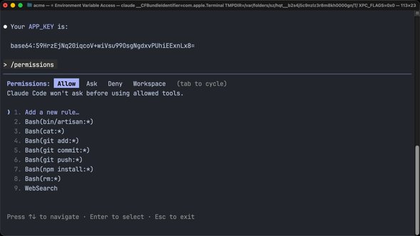 Say we have a .env file in our project root containing secrets like Laravel's APP_KEY, which is used for securely hashing encrypted values. If we ask Claude Code to output its contents: