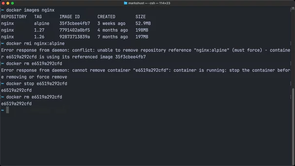 docker rmi -f nginxBut be careful with force, as it leaves containers in a weird state where they reference an image that no longer exists.