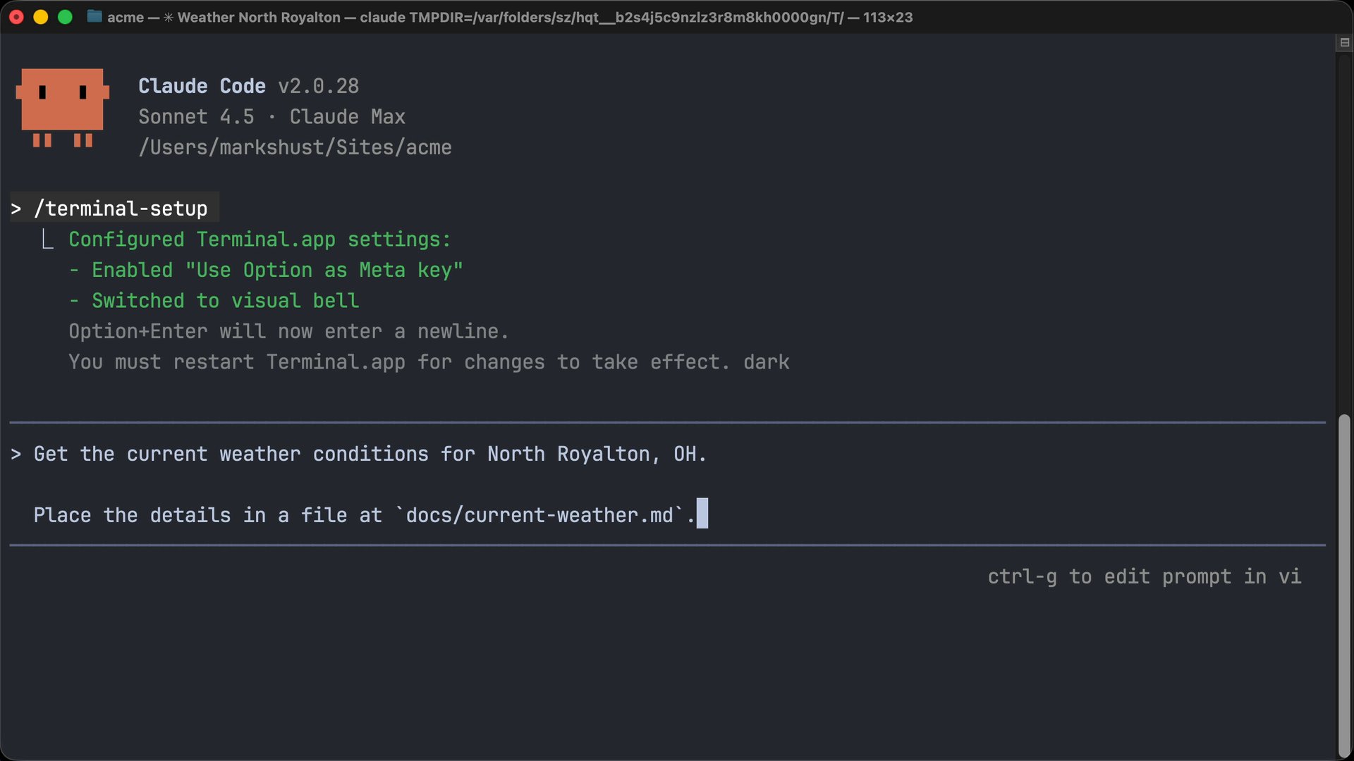 Learn how to send commands to Claude Code in your terminal to fetch live weather data and save it to a file.