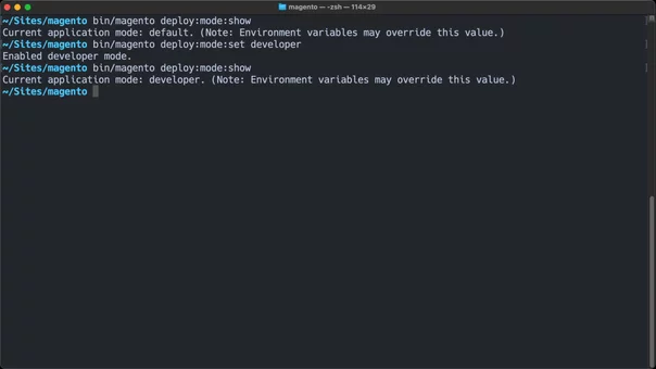 bin/magento deploy:mode:set developerImportant note: Never run developer mode in production! While it's perfect for local dev, it's significantly slower and less secure than production mode, among many other reasons.
