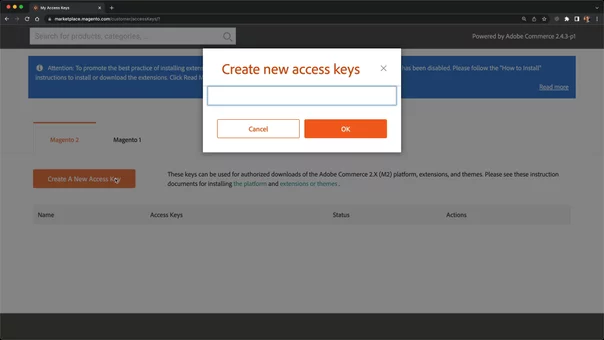Set up Magento Marketplace Composer auth credentials with access keys to download Magento modules securely.