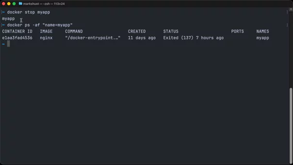 docker ps -af "name=myapp"The -a flag shows all containers, including stopped ones. Your container is still there, ready to be started again with all its configuration intact.
