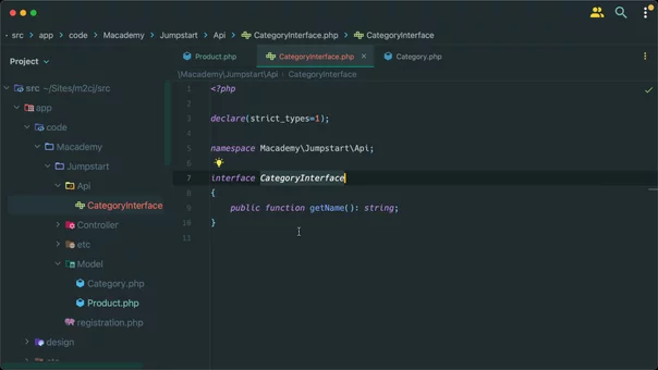 Here's how we'd create this interface. We’d create a new Api directory in our module, and then a new PHP file named CategoryInterface.php. This will be a simple interface, with a single function which must be implemented, named getName():